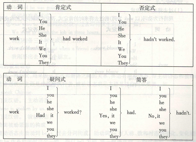 现将行为动词(以work为例)的过去完成时的肯定式,否定式和疑问式的构成列表如下: